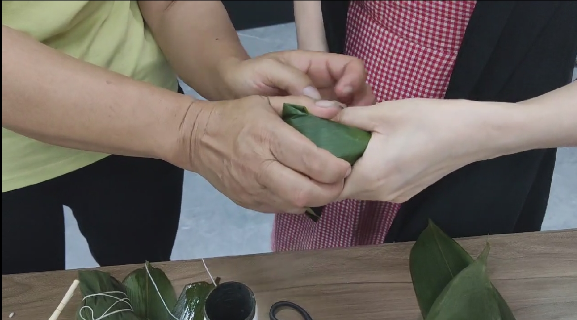 阿姨正在细心指导大家包粽子: